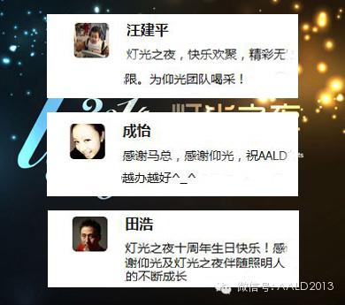 每年的灯光之夜都群贤毕至、星光熠熠,今年的灯光之夜也不例外,两百余位行业专家、市政管理者、房地产商、照明设计师、建筑设计师、景观设计师、室内设计师、工程公司代表、厂商代表及媒体等重量级嘉宾聚首灯光之夜。2014年“灯光之夜”的微信互动,把与会嘉宾的最美寄愿都记录了下来。今天,小A随机挑选了部分寄语,带你重温当晚的美妙时刻(如下排名不分先后):
