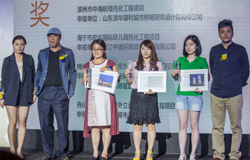 光说故事(北京)文化创意有限公司总设计师郑见伟先生(左一)、同济大学建筑与城市规划学院视觉与照明艺术研究中心教授/博士生导师郝洛西女士(左三)、亚洲照明设计师协会(AALD)常务理事严永红女士(右一)为铜奖获奖单位颁奖