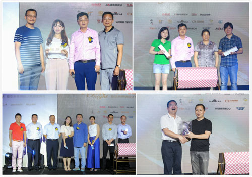 抽奖现场,左上图为仰光传媒创始人马彬先生(左三)为一等奖获得者颁奖,右上图为仰光传媒创始人马彬先生(左二)和中国照明电器协会理事长刘升平女士(左三)为二等奖获得者颁奖,左下图为深圳市千百辉照明工程有限公司董事长沈永健先生(左二)和光说故事(北京)文化创意有限公司总设计师郑见伟先生(左五)为三等奖获得者颁奖,右下图为思尚家具总经理陈敏先生(右)为幸运奖获得者颁奖